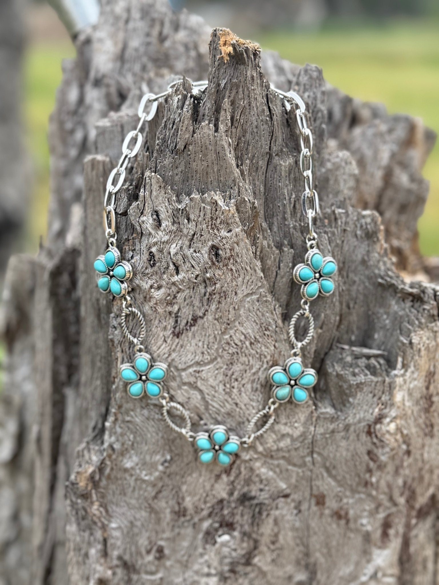 The Turquoise Florals Necklace is where classic Western charm meets delicate turquoise bloom beauty. Featuring turquoise stones shaped like little blossoms, each one carries a touch of desert magic. Strung on a chunky chain, this necklace is made to add a fresh but grounded sparkle to your look—whether you’re ropin’ cattle or just ropin’ in compliments.