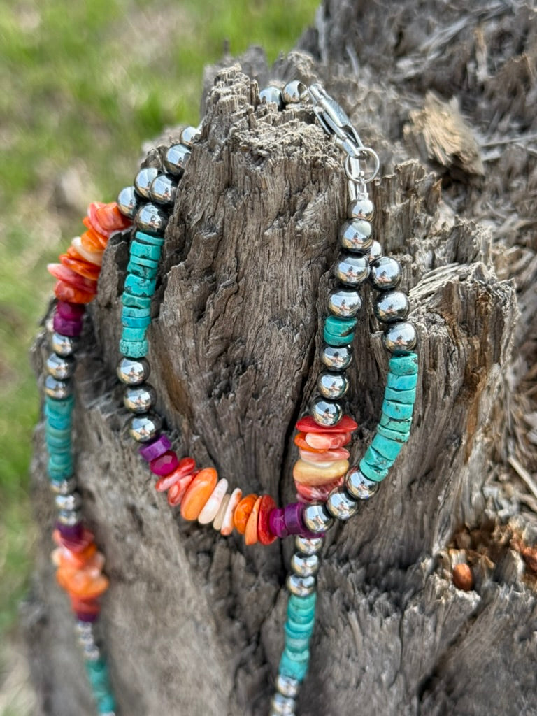 Capture the vibrant soul of the Southwest with our Desert Prism Beaded Bracelet! This isn’t just a piece of jewelry; it’s a wearable sunset on your wrist. Featuring a stunning rhythm of genuine turquoise heishi, fiery spiny oyster shells, and shimmering metallic accents, this bracelet brings a high-energy pop of color to any outfit.