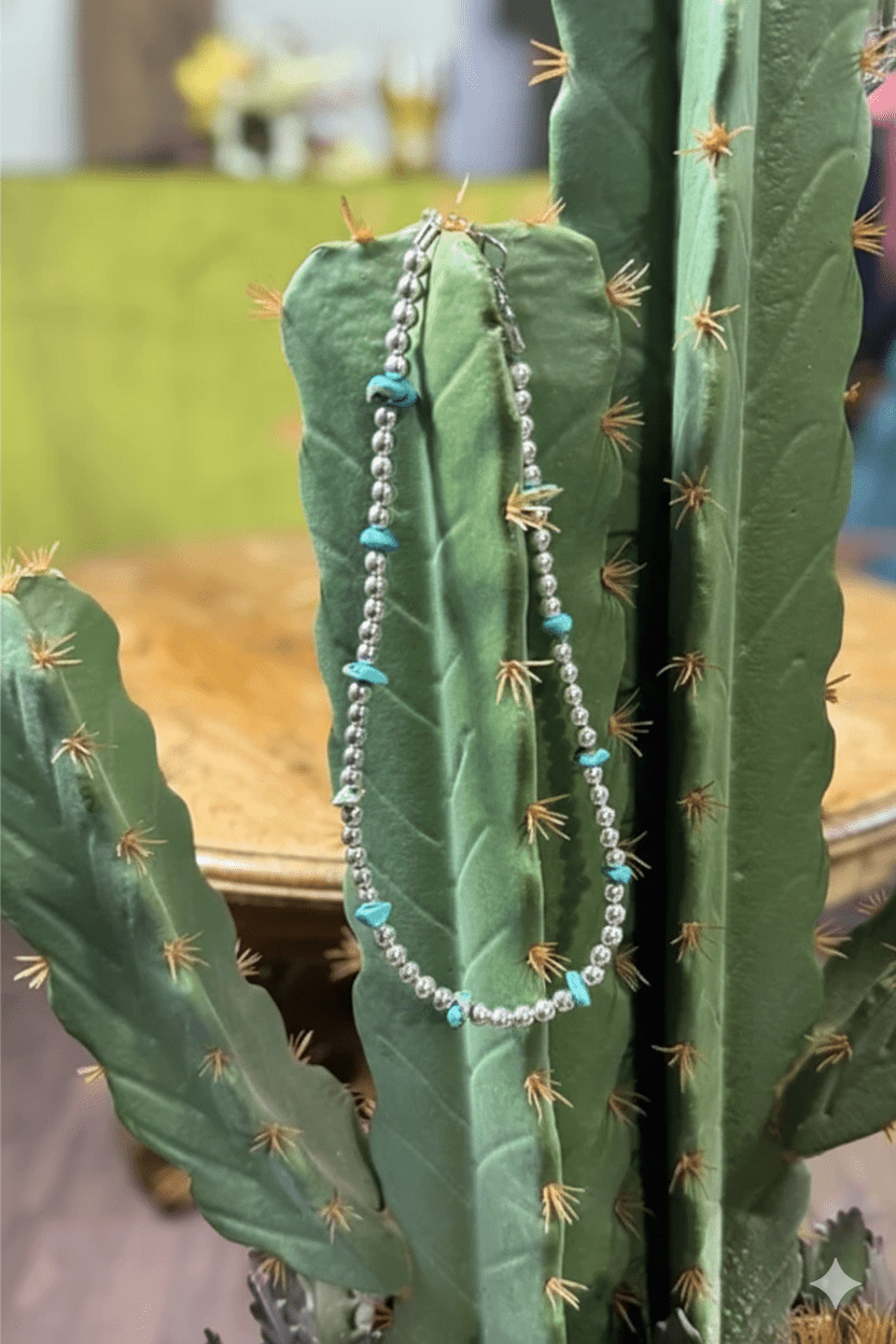 Channel those effortless coastal-meets-canyon vibes with the Down Valley Turquoise and Pearl Beaded Necklace. Featuring a rhythmic blend of high-shine silver spheres and raw, organic turquoise chips, this piece is the ultimate cool girl staple for your jewelry stack.