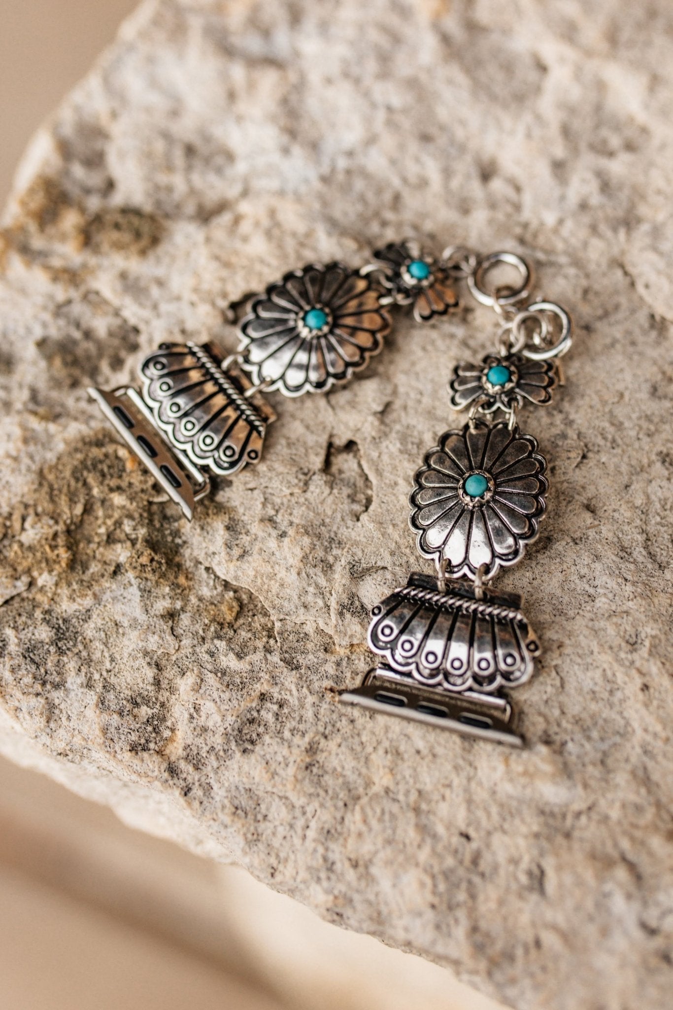 The Ribbon Concho Charm Apple Watch Band is Western charm meets modern flair. Featuring vintage-inspired silver ribbon conchos and dainty charm details, this band adds a stylish, rustic twist to your everyday tech. Comfortable, eye-catching, and full of personality—it's made for the cowgirl who likes a little bling with her notifications.