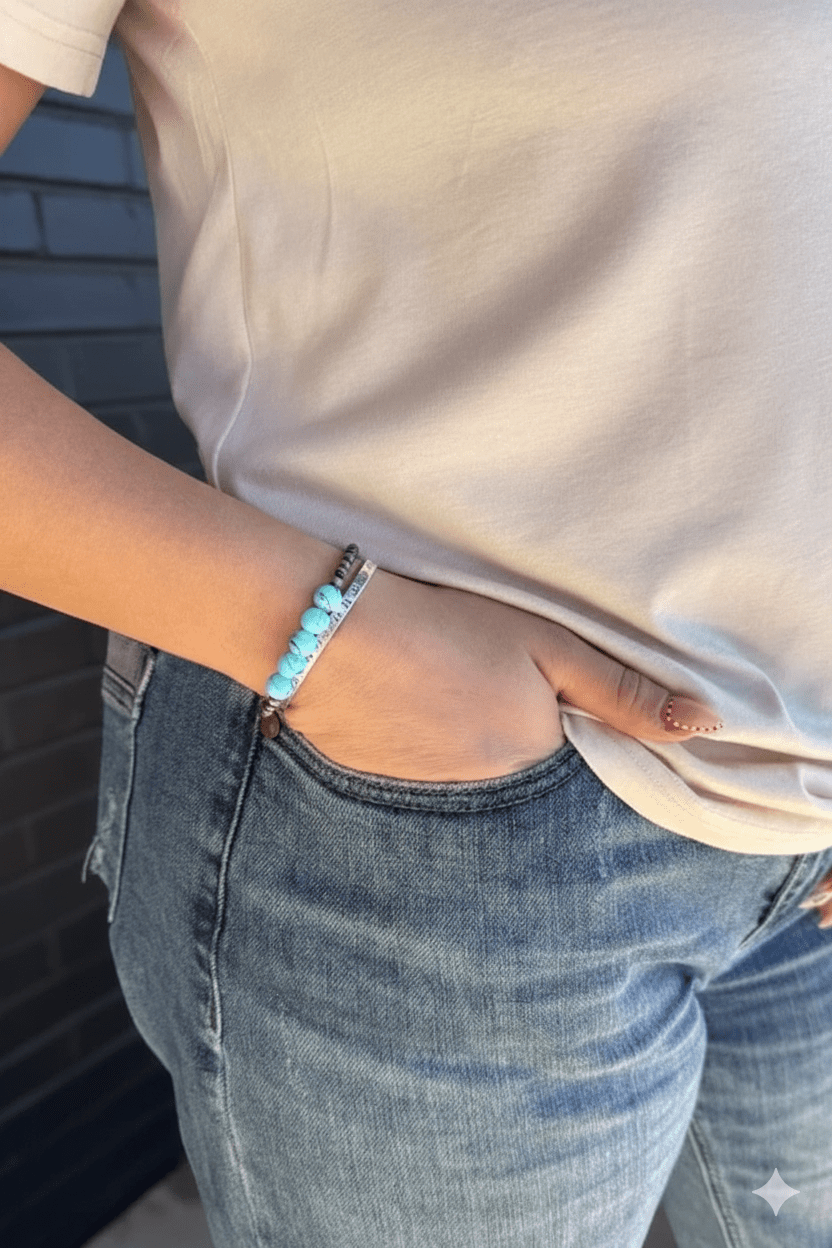 Bring a pop of desert-sky blue to your wrist with The Odessa Turquoise Stretch Bracelet. Featuring vibrant, marbled turquoise beads paired with a sleek metallic accent, this piece is the ultimate accessory. Effortless, earthy, and just a little bit edgy—it’s the low-maintenance glow-up your jewelry box has been waiting for!