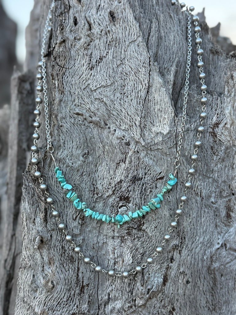 Double the layers, double the charm! This Turquoise Pearl Layered Necklace is your new go-to for effortless Southwest chic. Featuring a mix raw-cut turquoise chips and classic silver-polished beads, it perfectly balances earthy vibes with a polished edge. Whether you’re heading to a summer festival or just want to brighten up a white tee, this duo brings that perfectly put-together look without the tangle.
