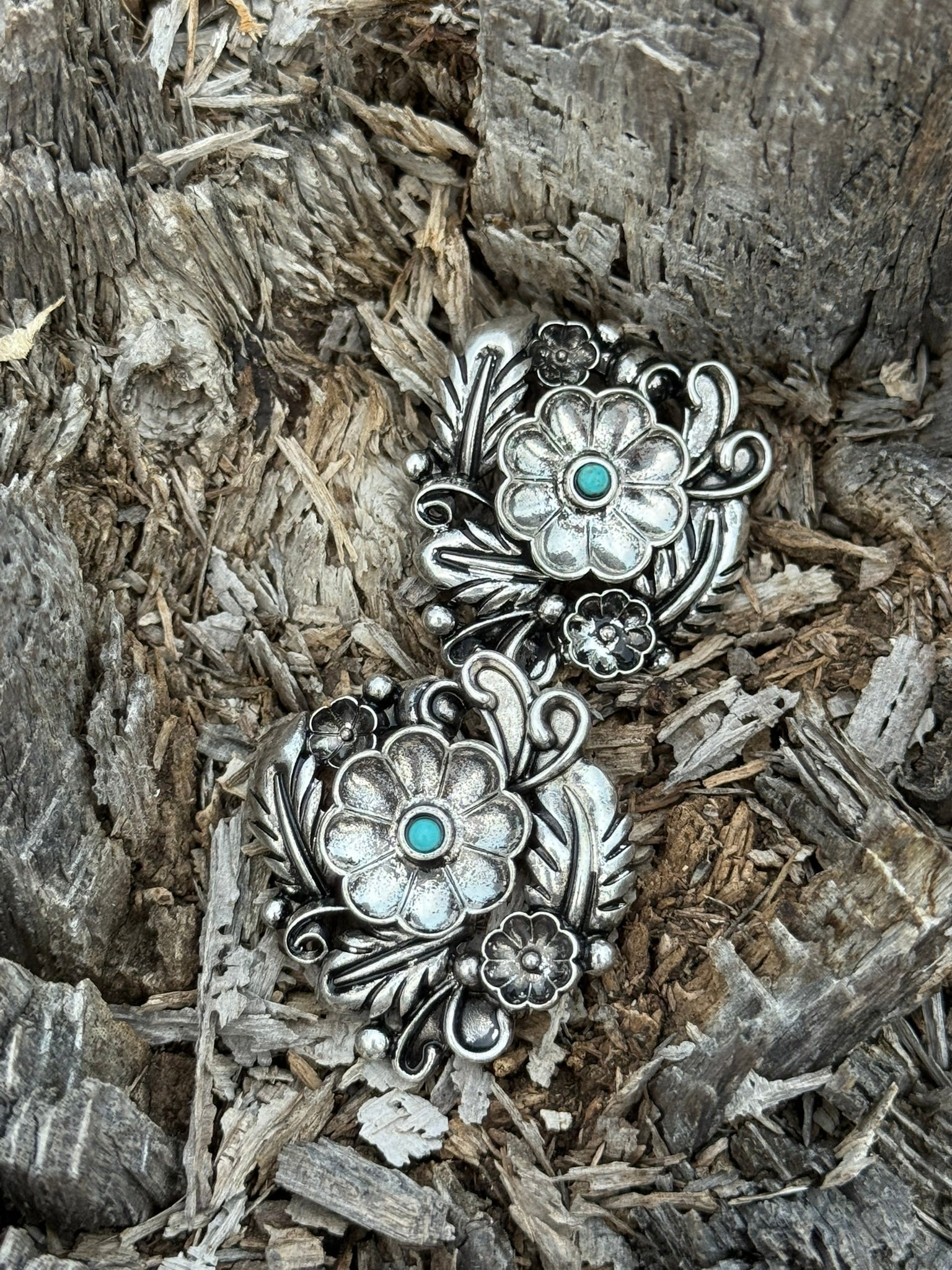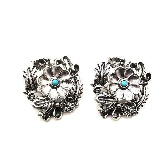 Get ready to wrangle some compliments with these Western Flower Concho Stud Earrings. They capture the spirit of the open range with their bold, oxidized silver tone and intricate floral wreath design, centered by a sassy pop of faux turquoise. Perfect for adding a little rootin' tootin' flair to your denim jacket, boots, or favorite sundress. These aren't just earrings—they're a little piece of the wild, wild West for your ears!