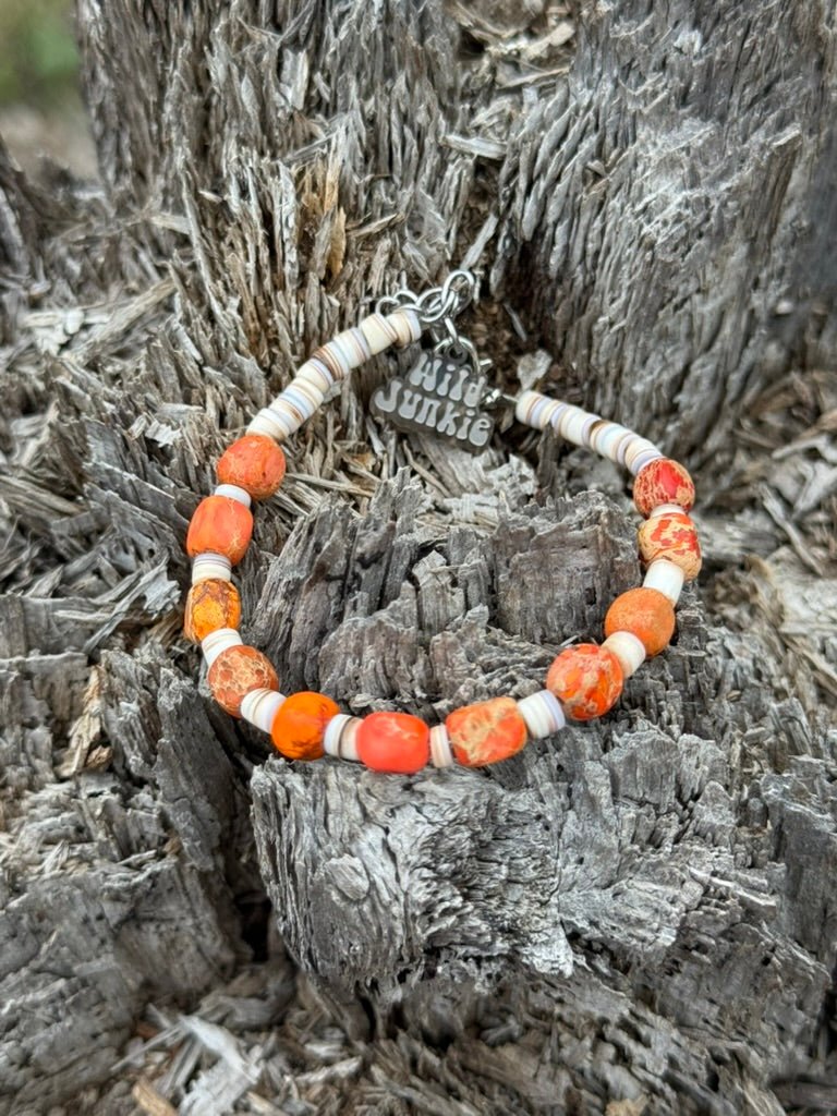 Capture the rugged beauty of the high desert with our Desert Ember Beaded Shell Bracelet. A piece that strikes a perfect balance between raw, natural texture and refined southwestern style, making it a versatile staple for any jewelry collection. This bracelet features genuine Spiny Oyster shell, celebrated for its vibrant range of fiery oranges, warm corals, and earthy creams.