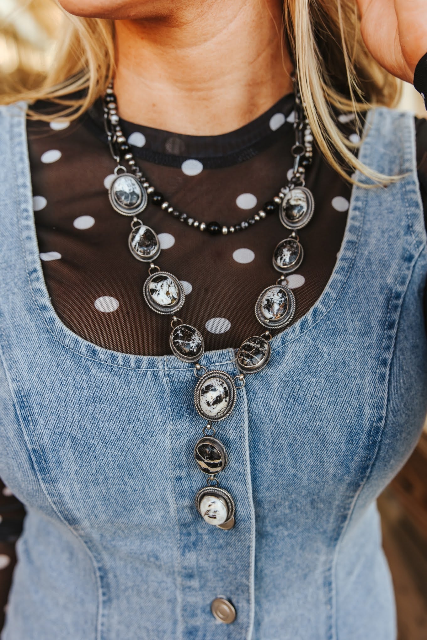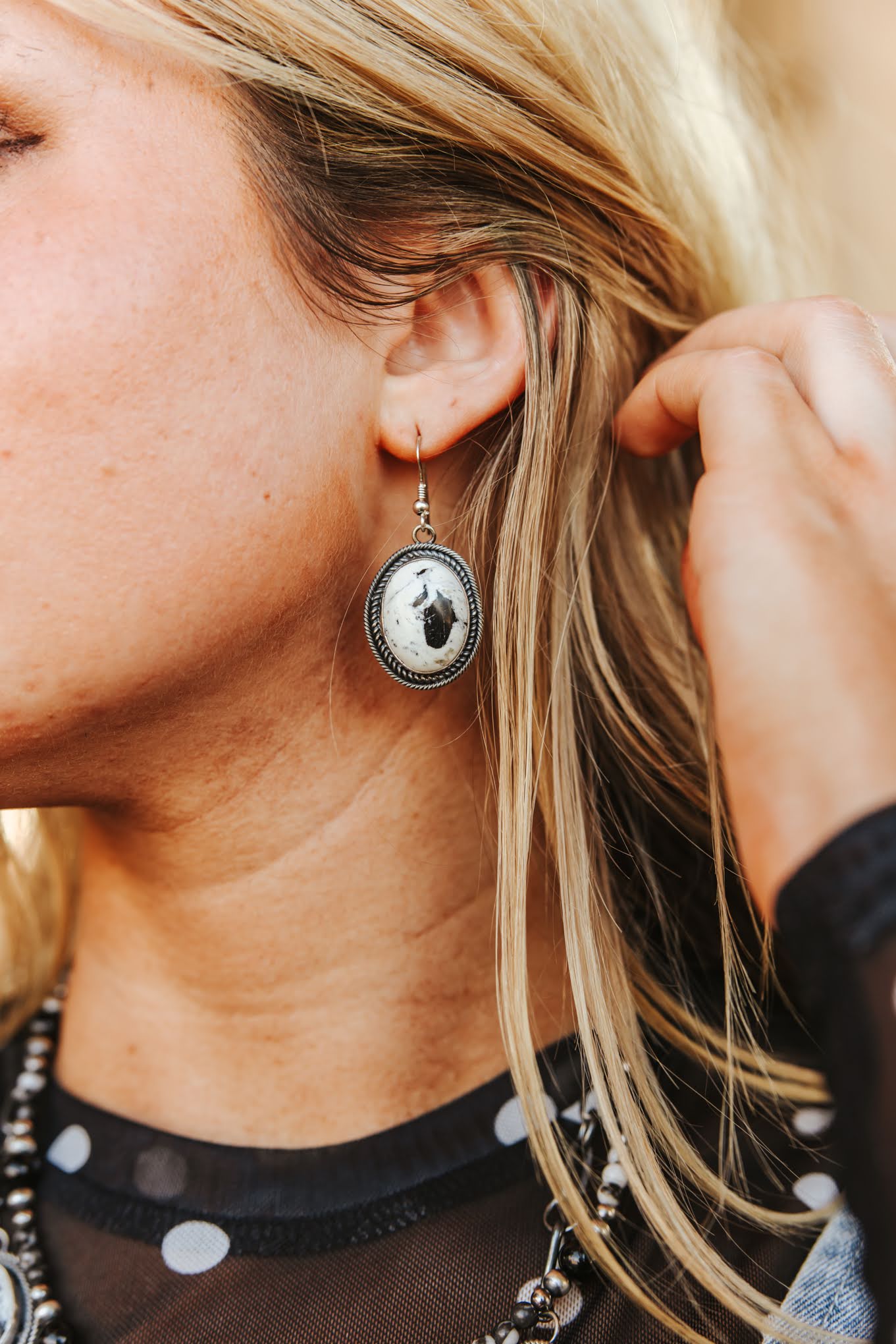 Get ready to wrangle some serious style with the White Buffalo Lariat Necklace and Earring Set! This stunning duo features mesmerizing white buffalo turquoise stones, each with its own unique snowstorm of black matrix, set in classic sterling silver. The graduated necklace creates a dazzling cascade, perfectly complemented by the matching drop earrings. It’s like a fresh snowfall on a desert mesa—crisp, bold, and absolutely beautiful!