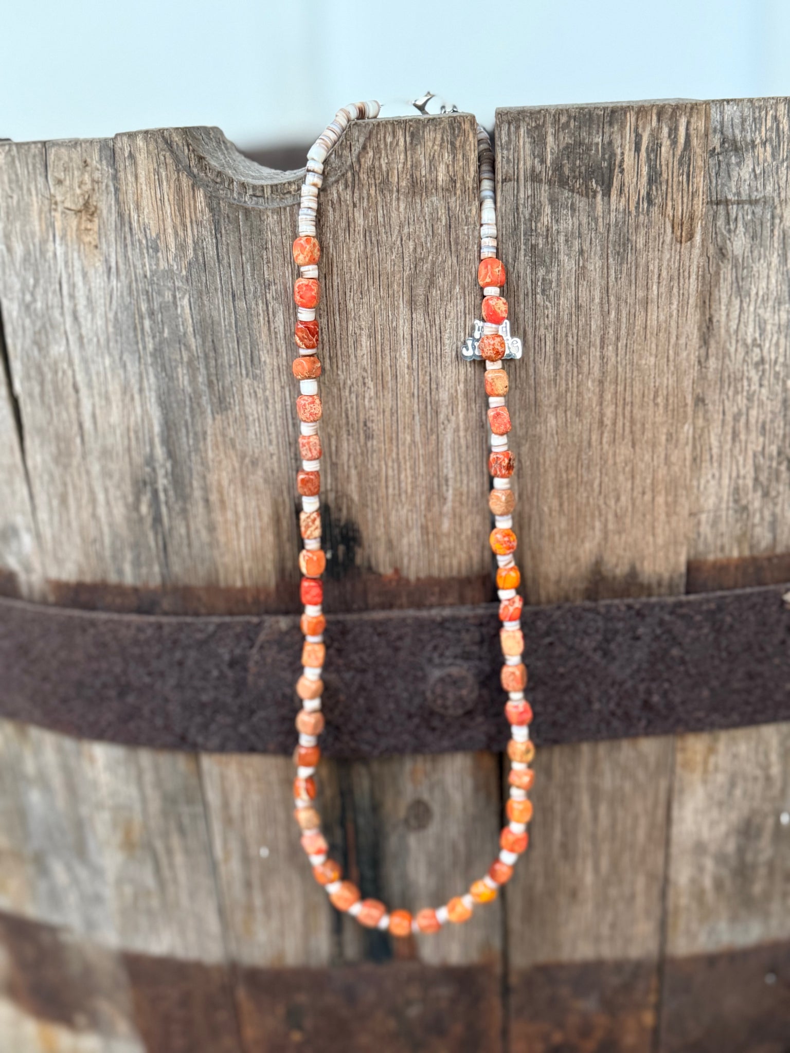 Capture the rugged beauty of the high desert with our Desert Ember Beaded Shell Necklace. A piece that strikes a perfect balance between raw, natural texture and refined southwestern style, making it a versatile staple for any jewelry collection. This necklace features genuine Spiny Oyster shell, celebrated for its vibrant range of fiery oranges, warm corals, and earthy creams.