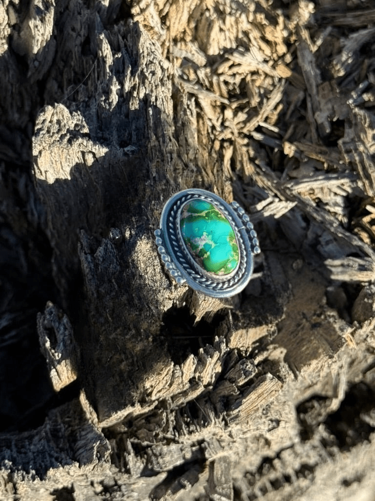 Feast your eyes on this stunning Large Sonoran Turquoise Oval Ring, a bold statement piece dripping with Western allure and timeless authenticity. Featuring an authentic turquoise stone shaped into a striking oval, set in sleek sterling silver, this ring brings vibrant color and wild western charm to any hand.