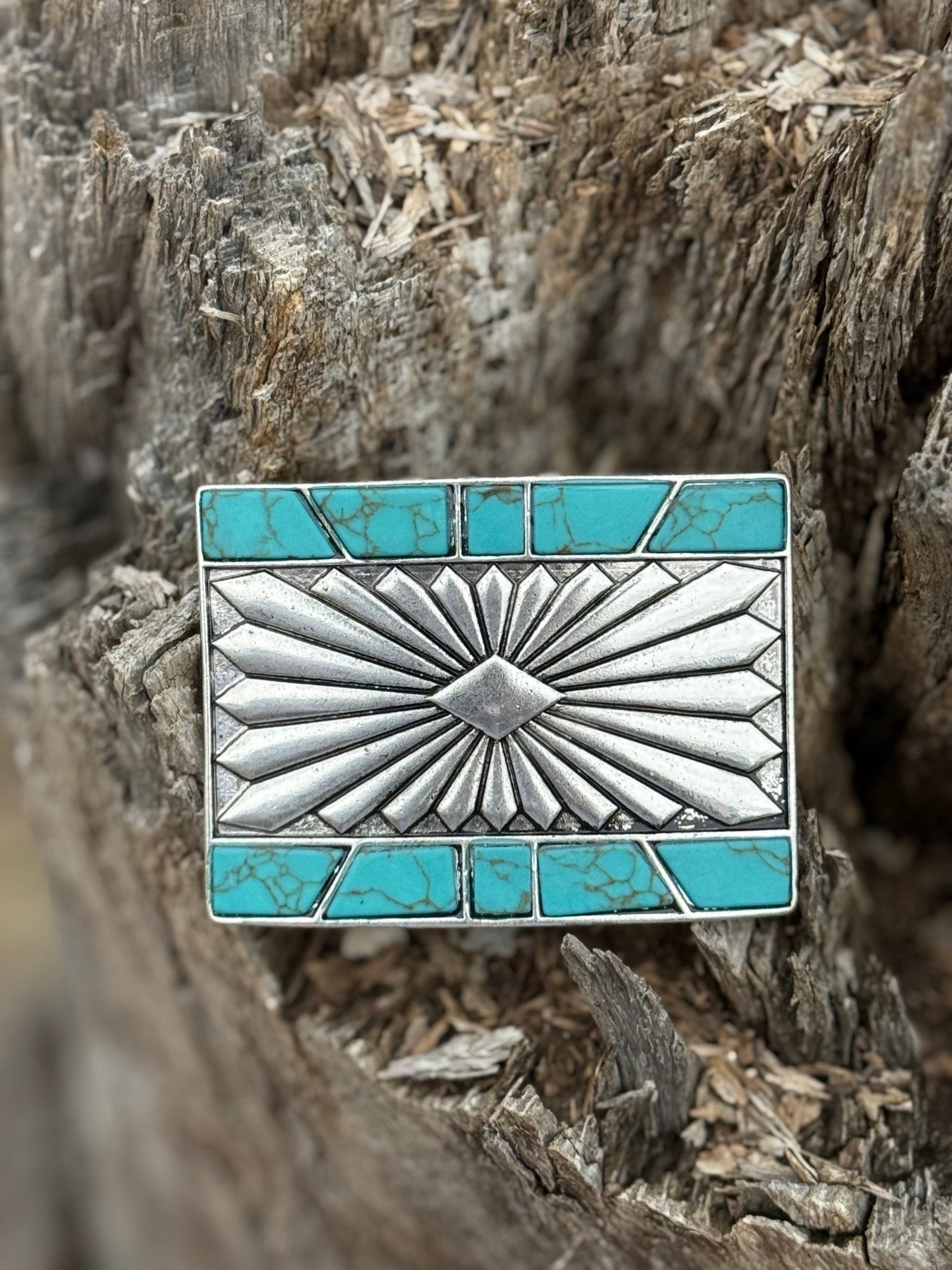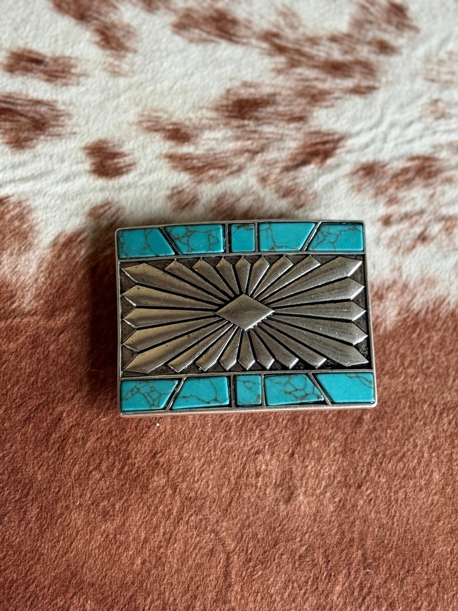 Saddle up with some serious color. This Western Turquoise Concho Belt Buckle is a celebration of the Southwest—vibrant, detailed, and full of charm. With a silver-tone finish and a burst of hues beautifully framed by geometric segments of mosaic-style turquoise, each corner tells its own story. Whether you’re dressing up denim or cinching a flowy dress, this buckle brings a kick of cowgirl attitude with a rainbow twist.