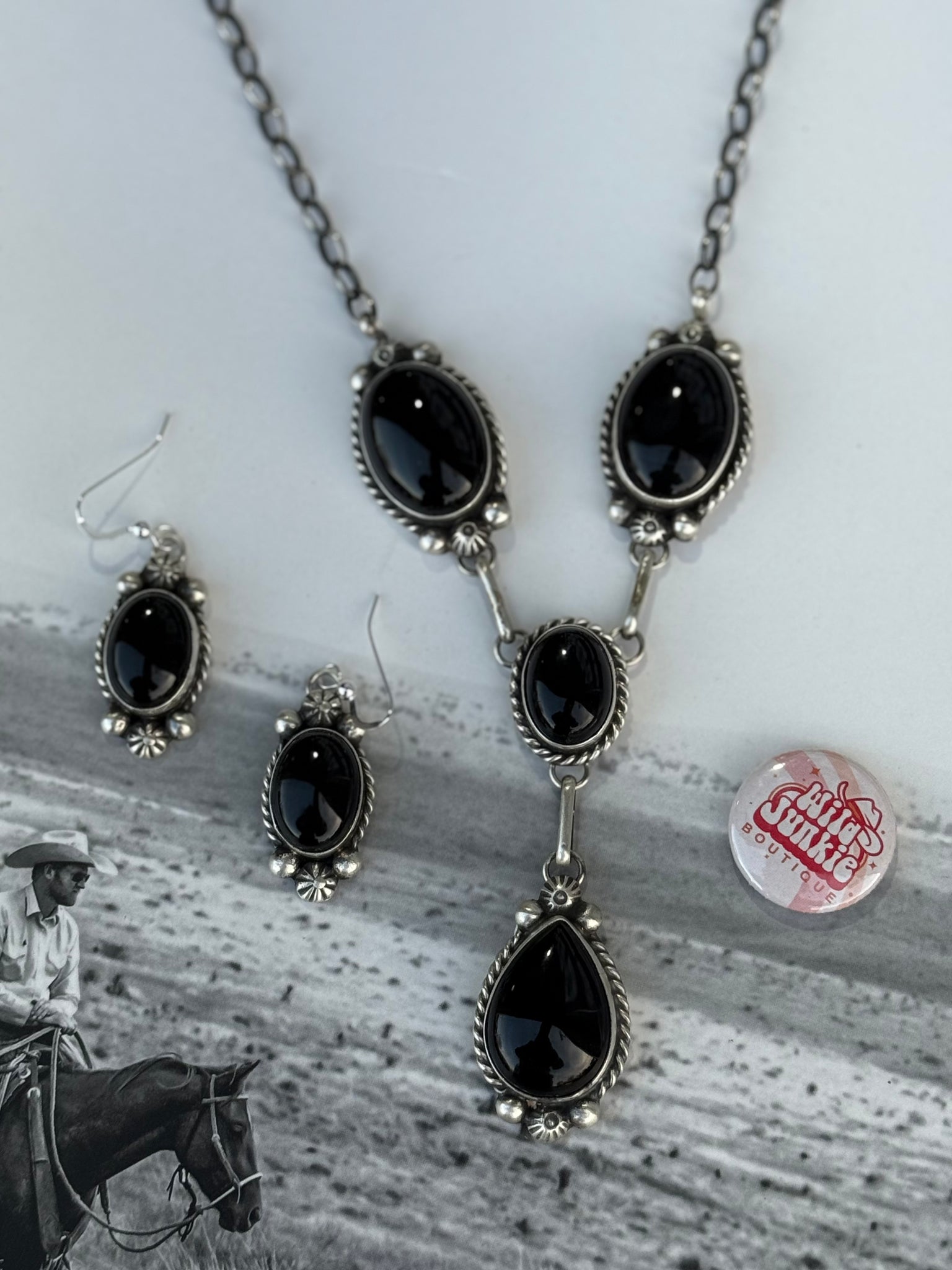 This Black Onyx Conch Lariat Necklace And Earrings combo is all the sass, zero brass. Featuring a gorgeous, natural shell in a shiny sterling silver bezel, creating a set that's perfect mix of rugged Western charm. It’s elegant, it’s black, and it definitely rides its own horse. Saddle up and snag this set!