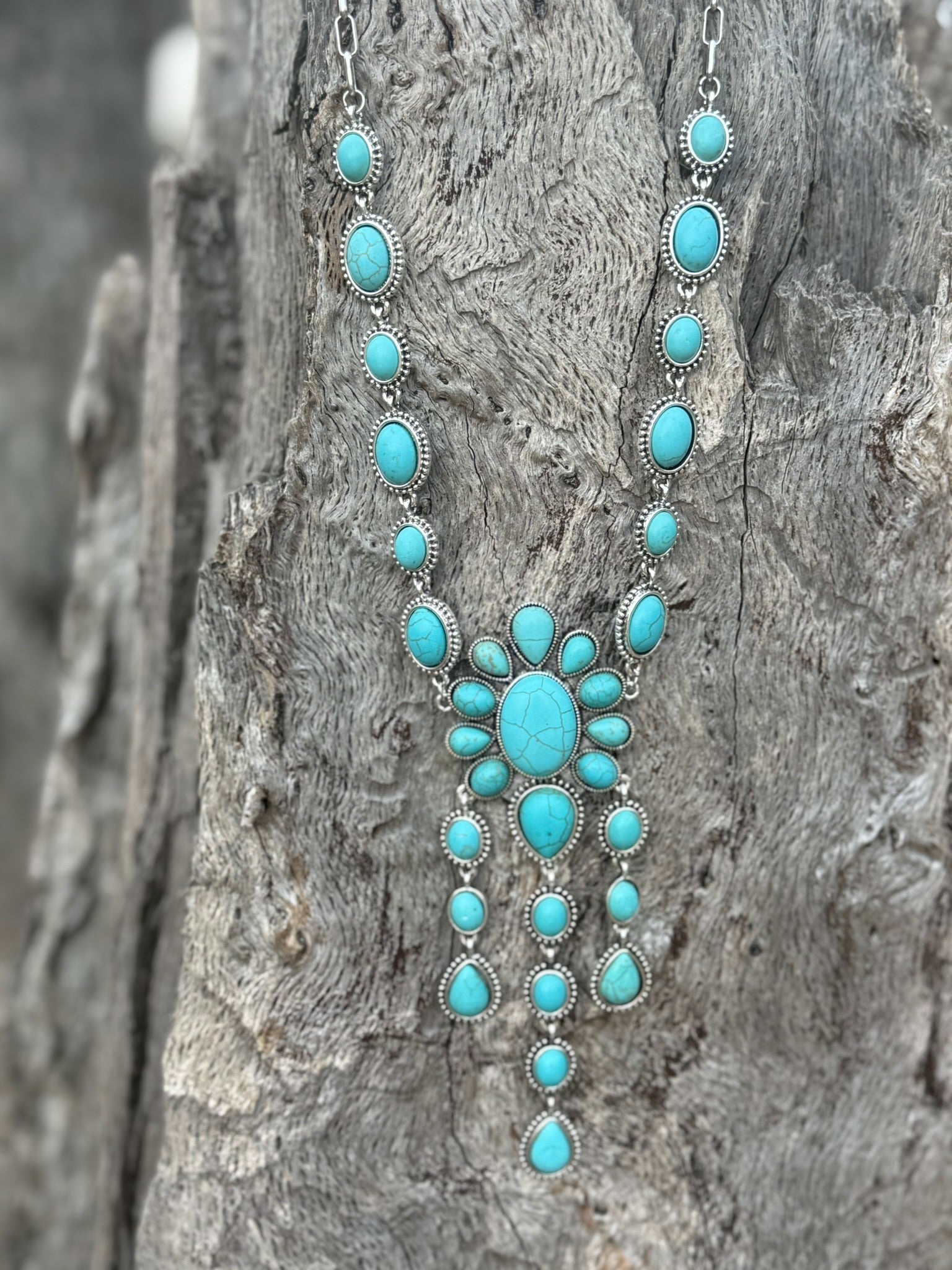 Make a breathtaking statement with this dramatic Arizona Sky Cluster Turquoise Lariat Necklace. Featuring a striking cluster of turquoise stones arranged like a blossoming flower, anchored by oval turquoise stones leading up to a classic silver chain. This bold, eye-catching piece is perfect for adding vibrant color and instant character to any outfit, embodying both elegance and Western flair.