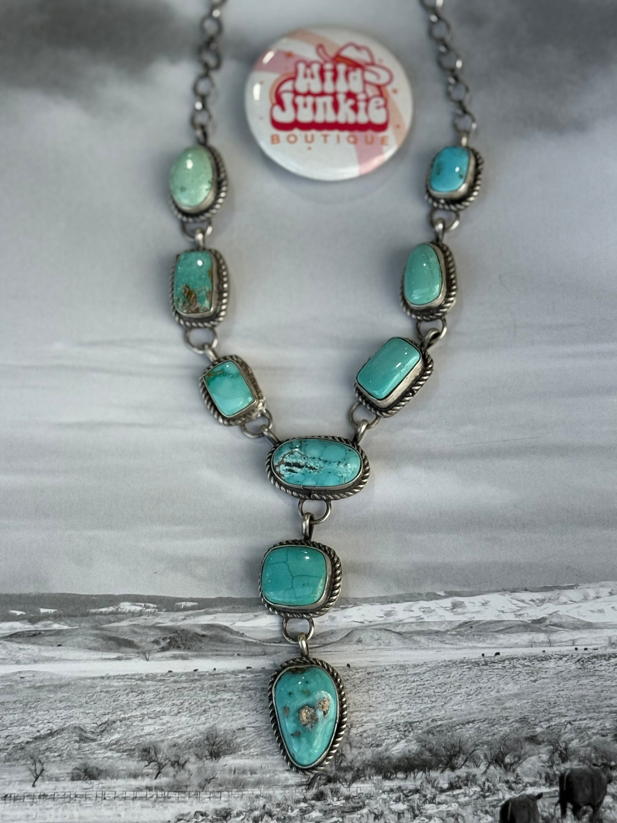 Elegant and timeless, this Authentic Turquoise Lariat Necklace is a masterpiece that merges cultural heritage and artisan craftsmanship. Featuring genuine turquoise stones strung along a sleek lariat design, crafted with sterling silver, this piece brings bold aqua elegance and rugged western flair to any outfit.