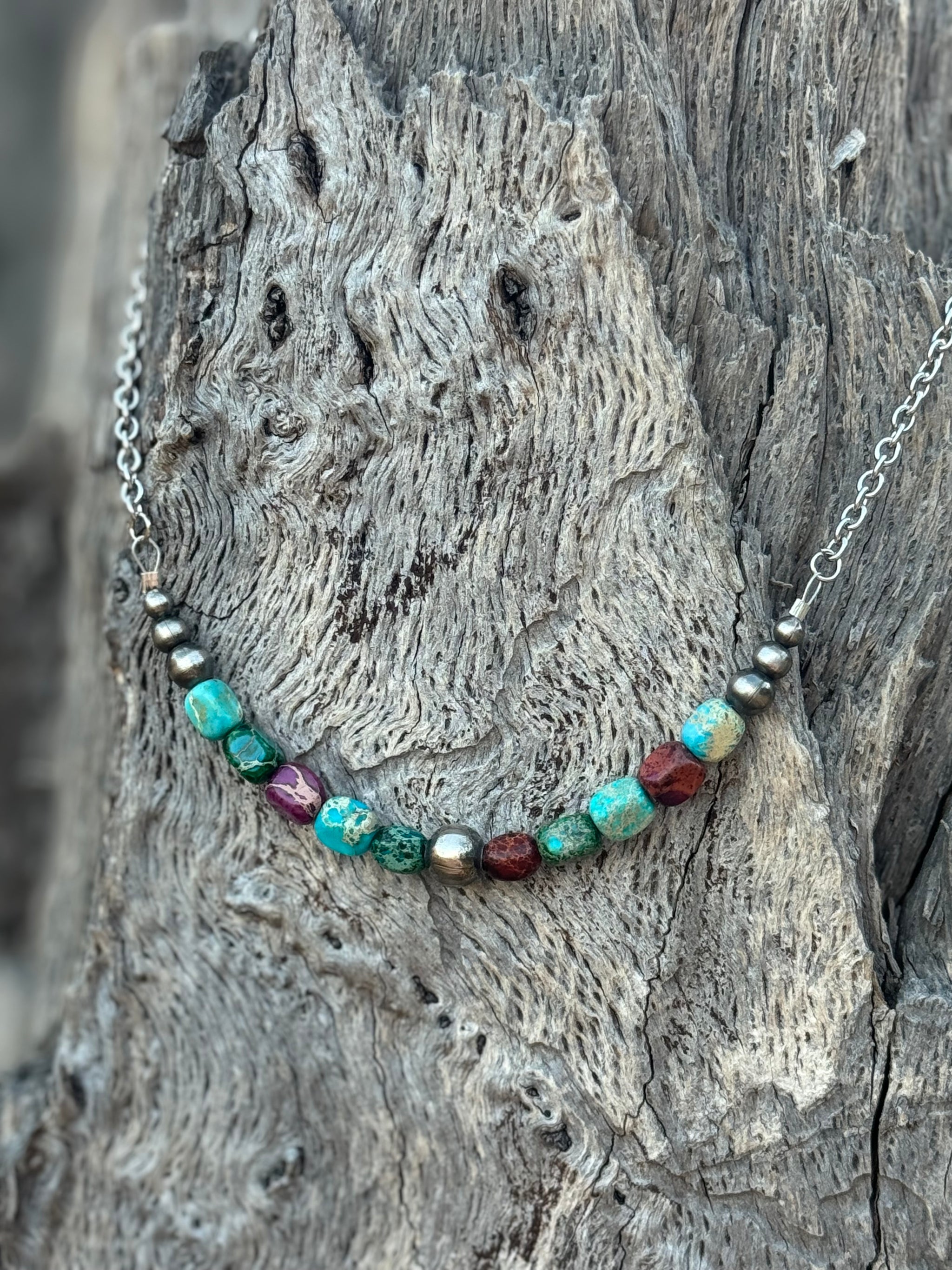 Tie your style to earth and sky with this Authentic Jasper Turquoise Chain Necklace. These multicolored beads, warm with creamy browns and rust tones are weave together with vibrant turquoise and silver pearl accents. Hung on a sturdy silver chain, each stone tells its own story—no two beads are alike.