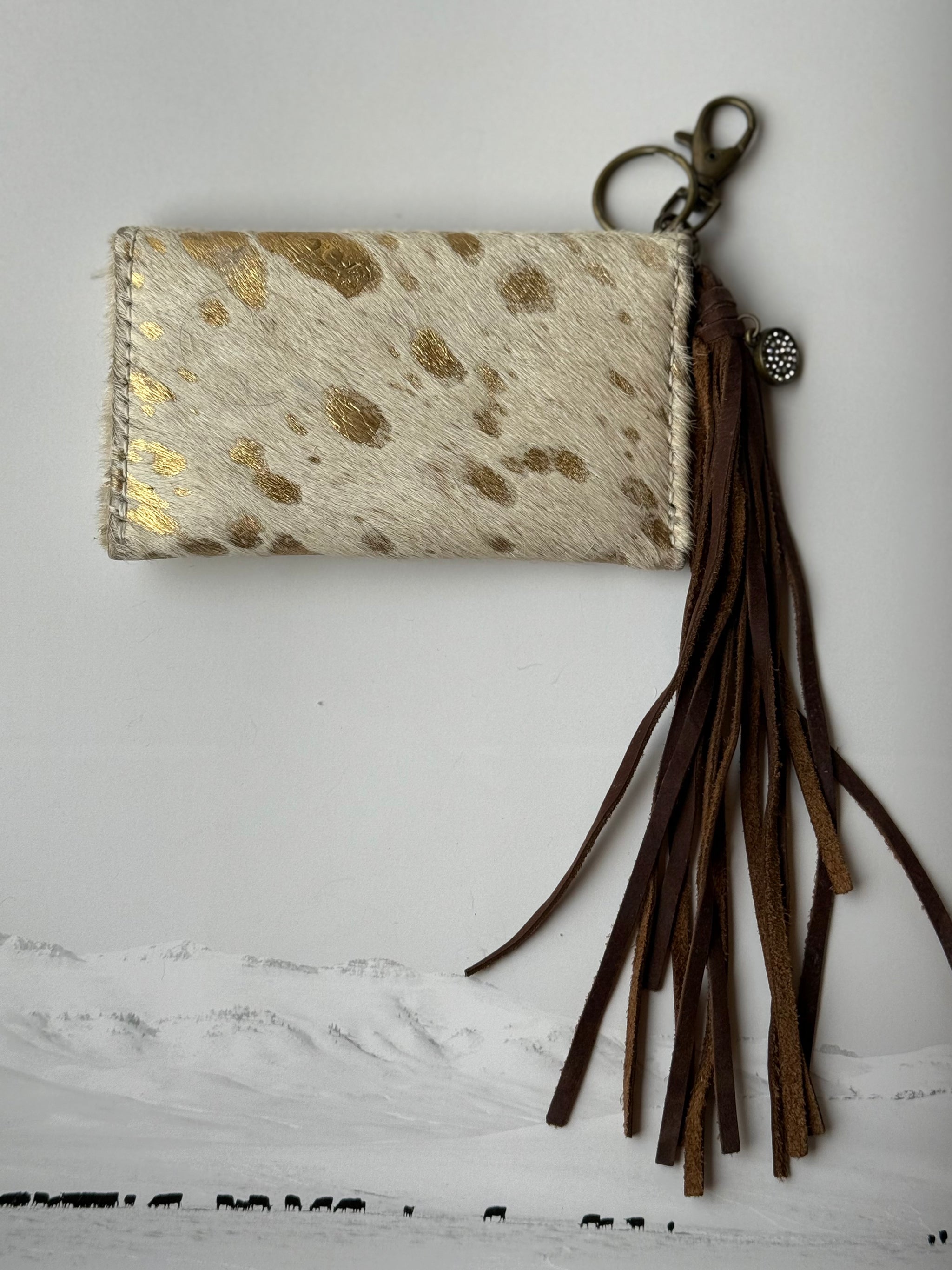 Lasso a little luxury with our Gold Dust Fringe Wallet Keychain, the ultimate blend of modern sass and rugged Western charm. Crafted from cowhide with a shimmering gold metallic splatter, this clutch features a bold, studded circular embellishment that screams high-end cowgirl with a generous, dark leather fringe that adds a playful swish to every step.
