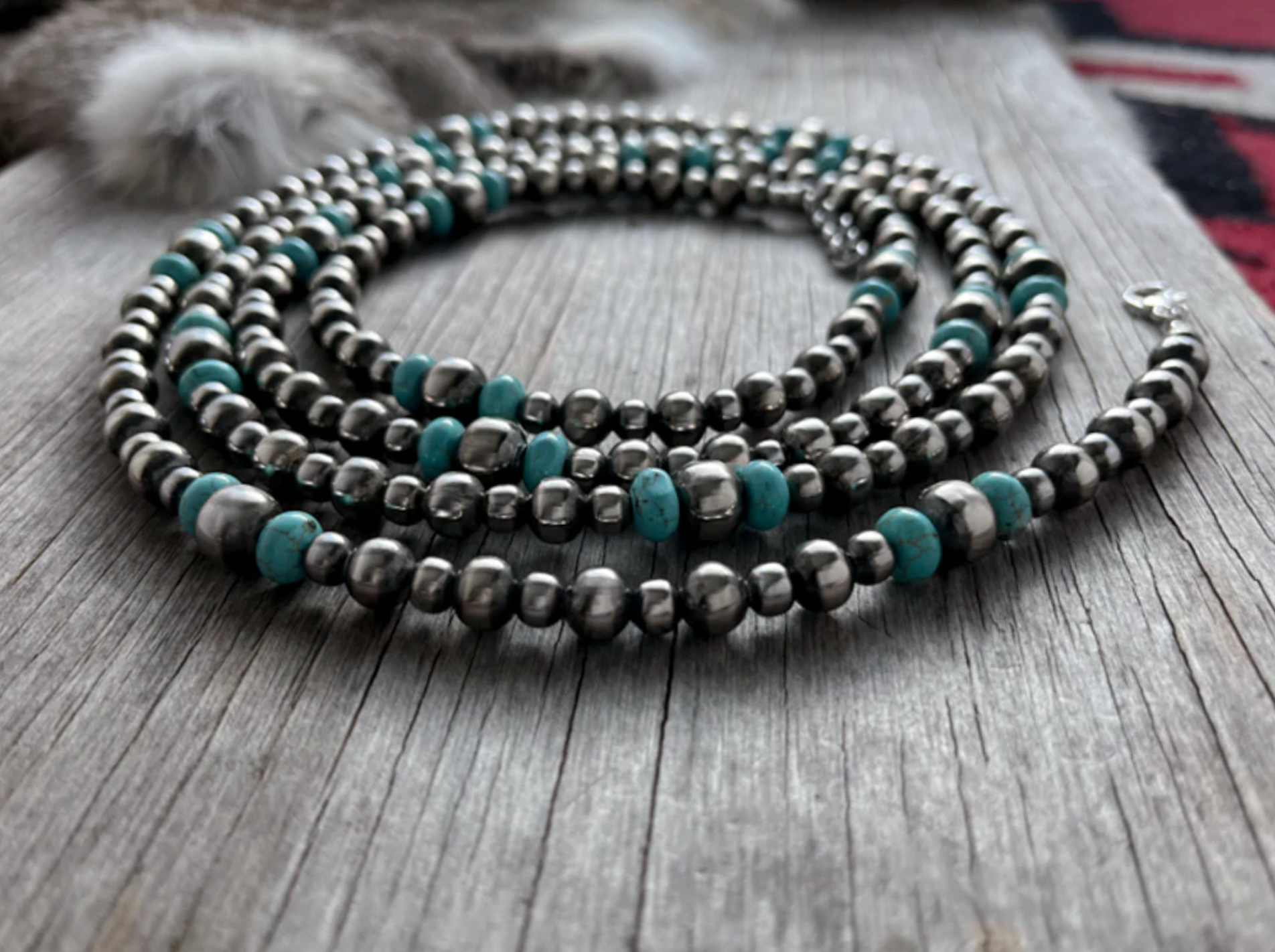The Long Silver Pearl and Turquoise Necklace is a stunning statement piece that effortlessly blends elegance with earthy charm. Strung with lustrous silver pearls and vibrant turquoise stones, this necklace creates a beautiful contrast of cool tones and natural texture.