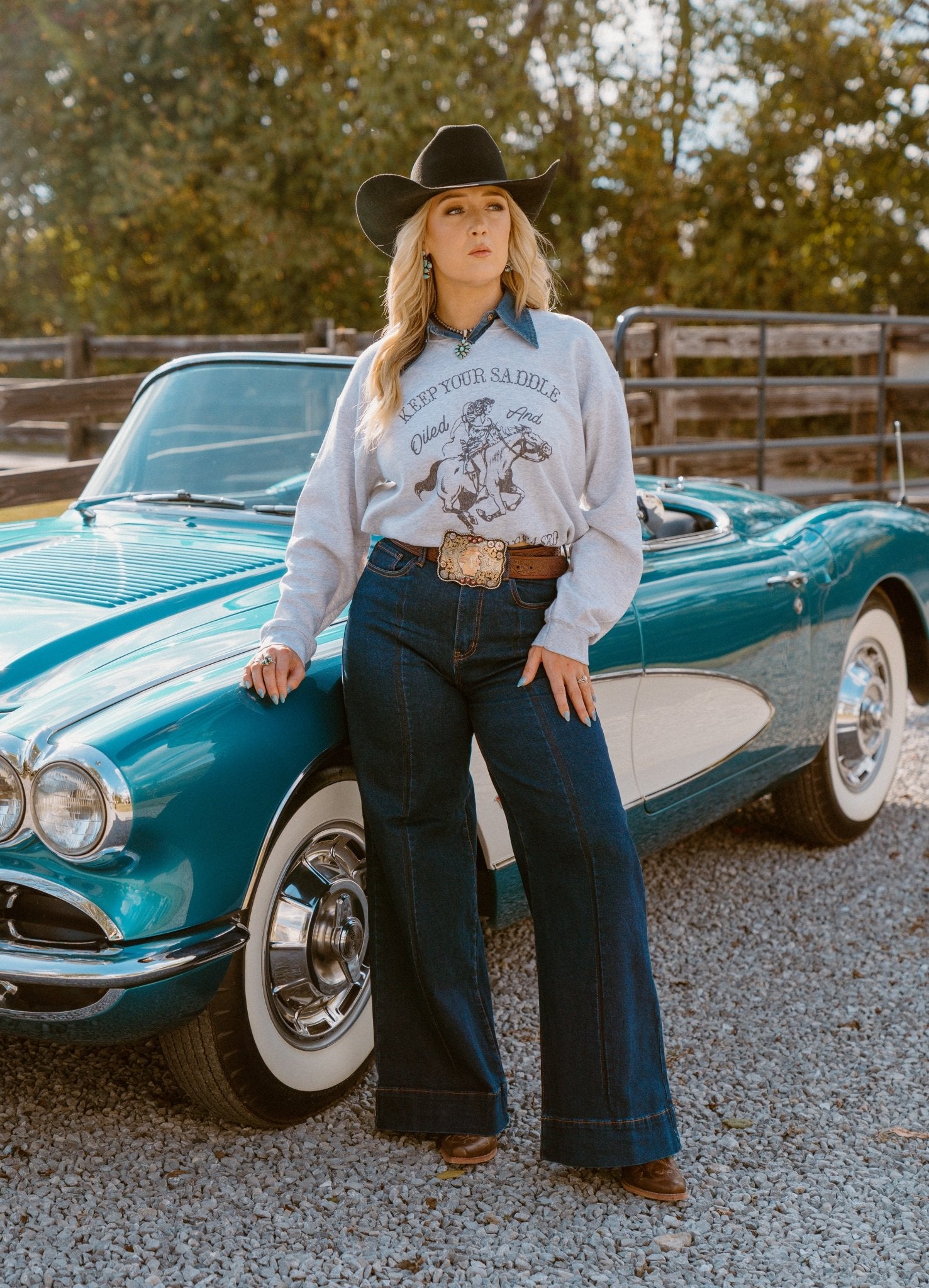 This ain't your grandpappy's sweatshirt. Featuring a Cut V-Neck and a slightly cropped raw hem design, this is a statement piece that blends rugged Western vibes with a modern, fashion-forward design. The iconic phrase "Keep Your Saddle Oiled and Your Guns Greased" is a reminder to always be prepared and ready for action.