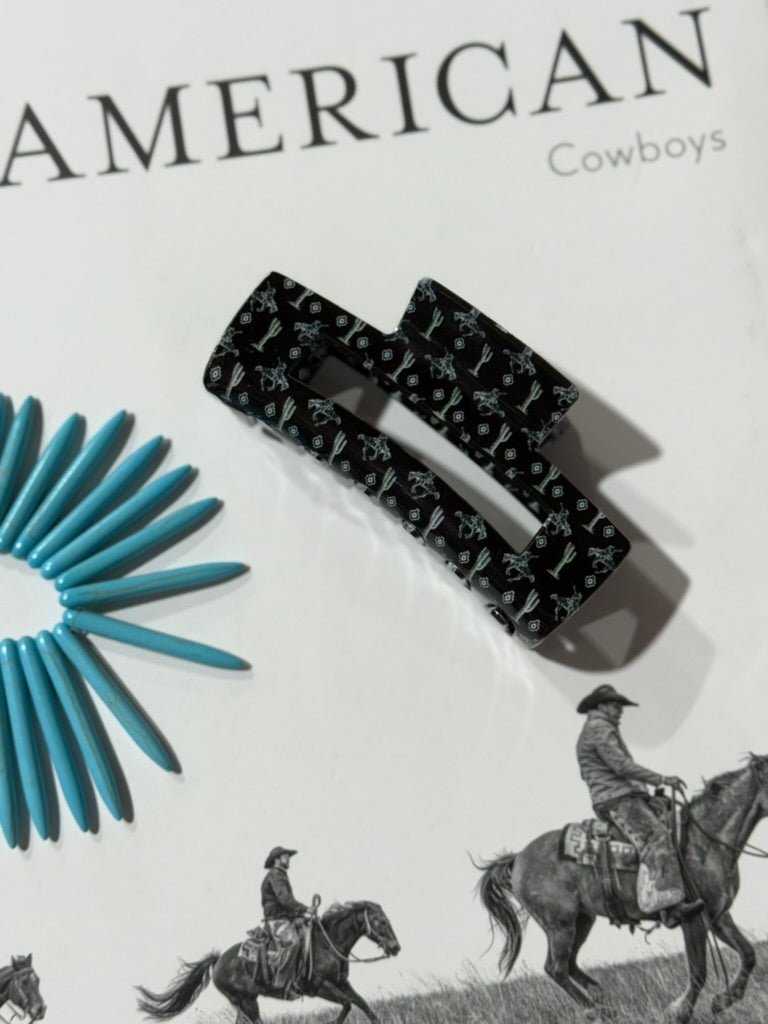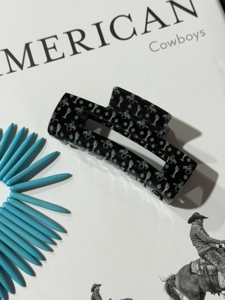 Embrace a touch of Western flair with this stylish Rectangle Hair Claw featuring a unique Cactus and Cowboy print. Its durable rectangular design is perfect for securely holding a variety of hair types and lengths, making it a functional and fashionable accessory.