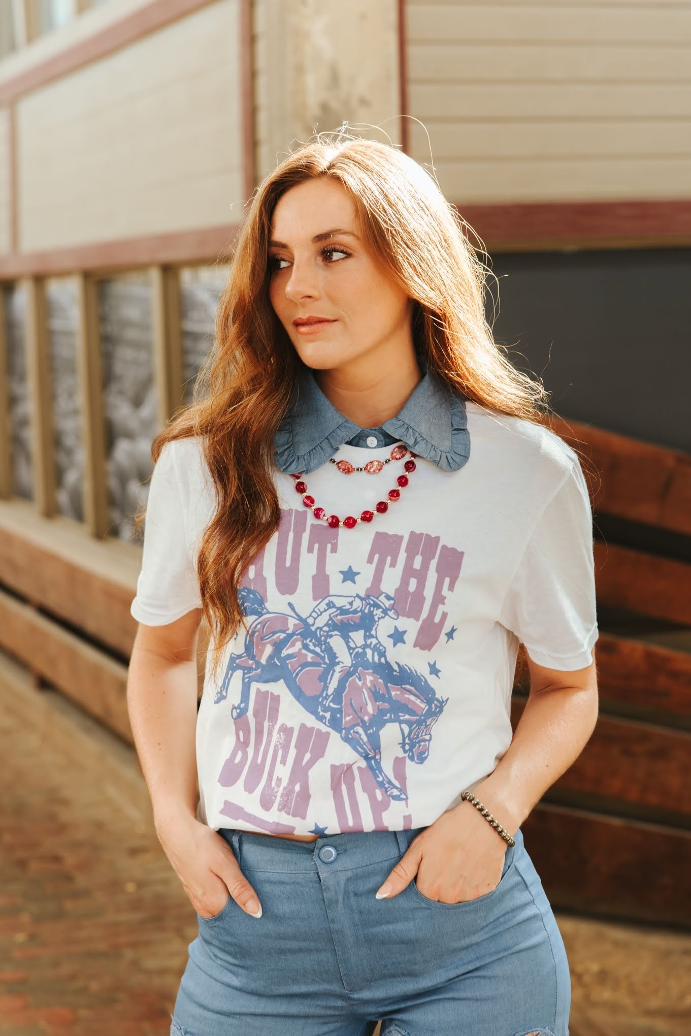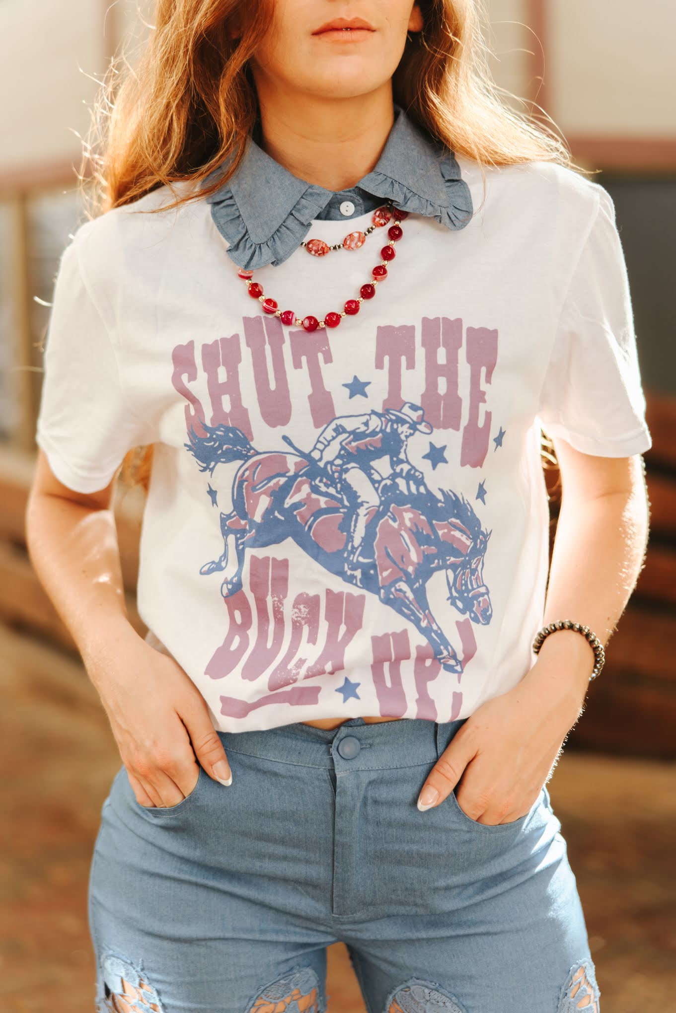 Channel your inner rodeo queen with the Shut The Buck Up Graphic Tee, the ultimate must-have for the girl who’s a little bit western and a whole lot of sassy. Featuring a bucking bronco design in punchy purple and blue tones, this tee pairs perfectly with your favorite denim and a bold squash blossom necklace.