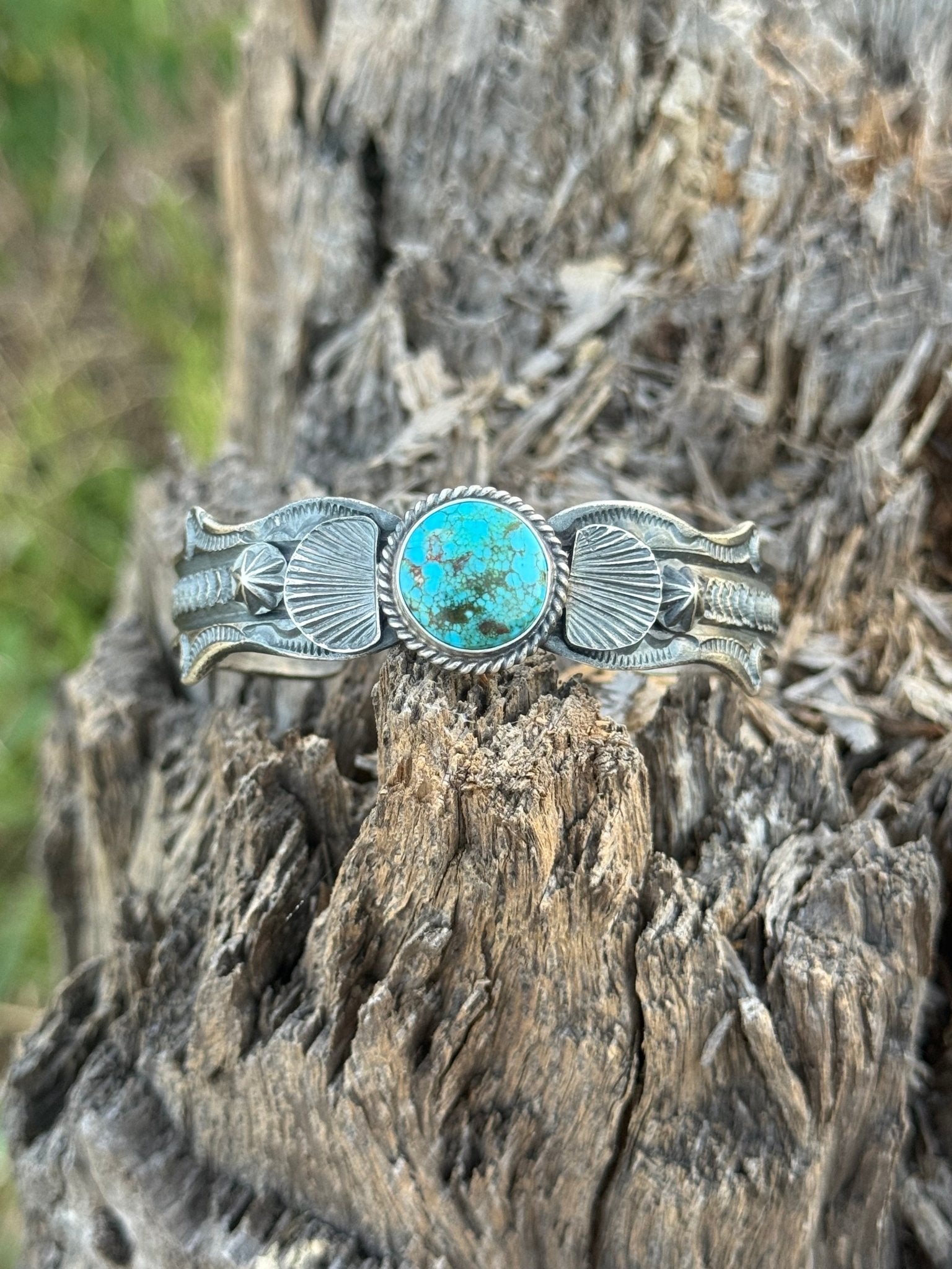 Channeling the spirit of Southwestern heritage, the Belle Authentic Cuff Bracelet is a timeless statement piece. At its heart lies a stunning authentic turquoise, nestled within a skillfully crafted sterling silver cuff. The setting is adorned with traditional stamped motifs—perhaps arrowheads or scalloped edges—infused with an artisan’s touch that elevates its rustic elegance. This cuff is more than adornment: it’s wearable history.